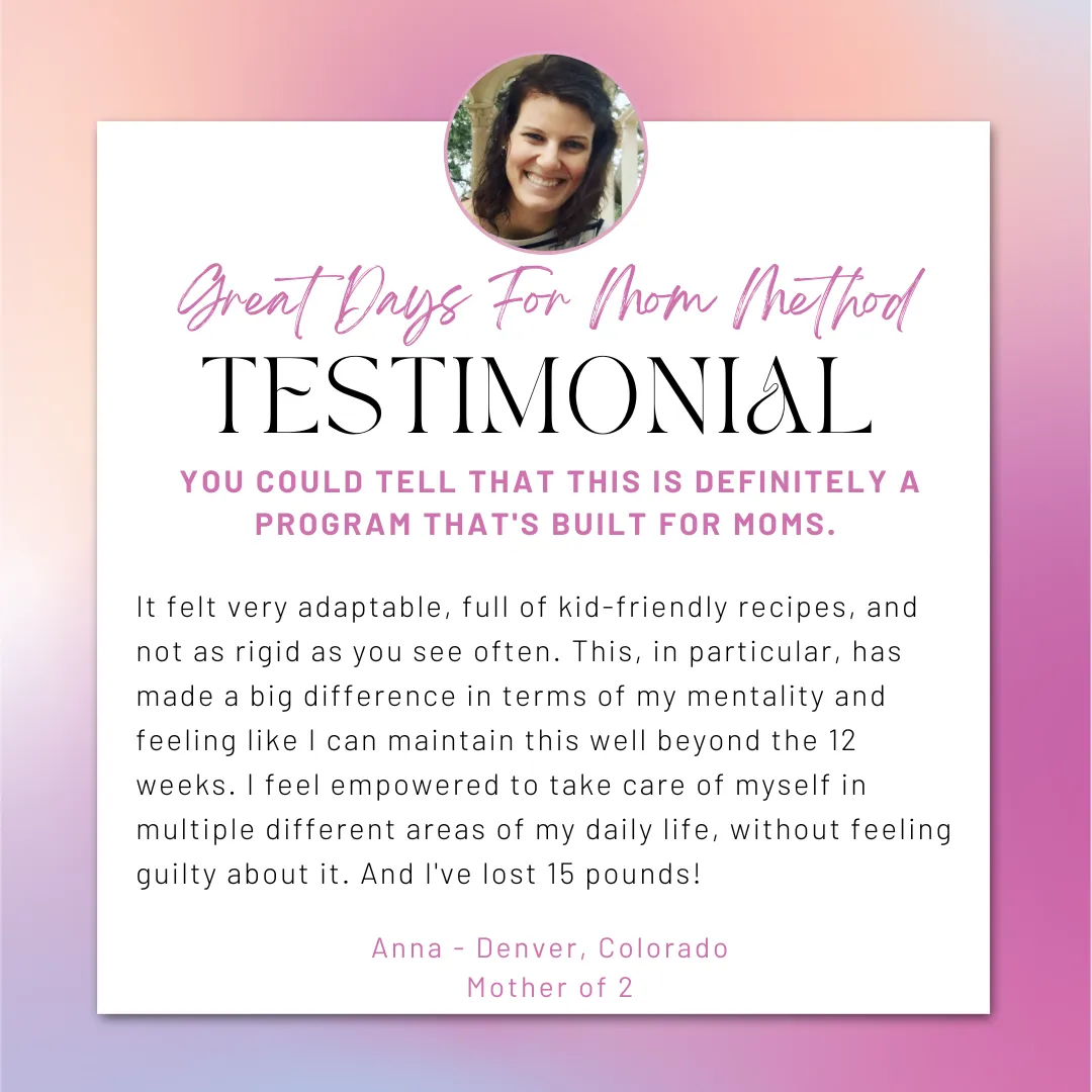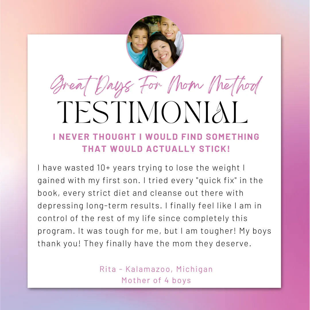 Results may vary based on individual effort and consistency. The Great Days For Mom Method is designed to support a healthier lifestyle and provide quick, sustainable changes, but it is not a substitute for medical advice. Always consult with your healthcare provider before beginning any new fitness or nutrition program. This program is not intended to diagnose, treat, or cure any medical conditions.